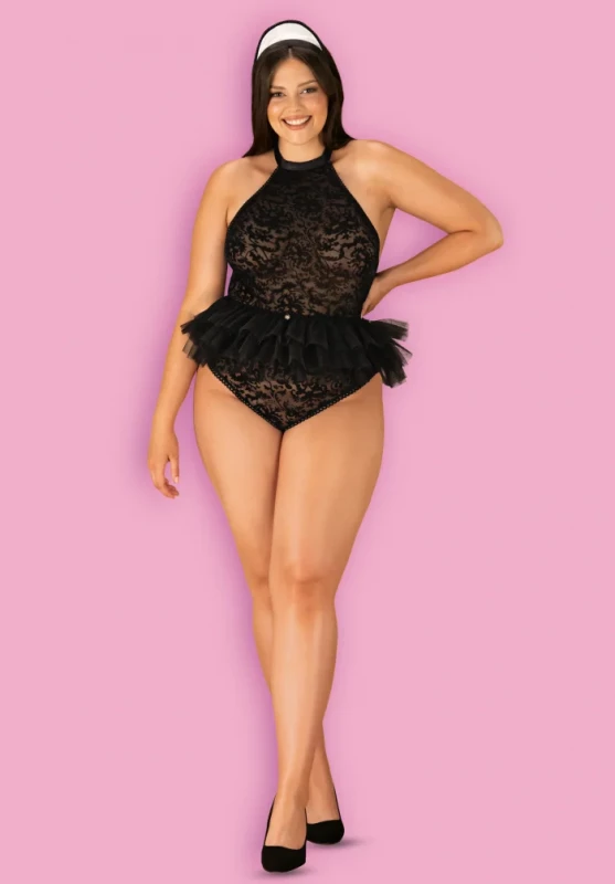 соблазнительное боди с открытой спинкой, юбка-пачка, головной убор